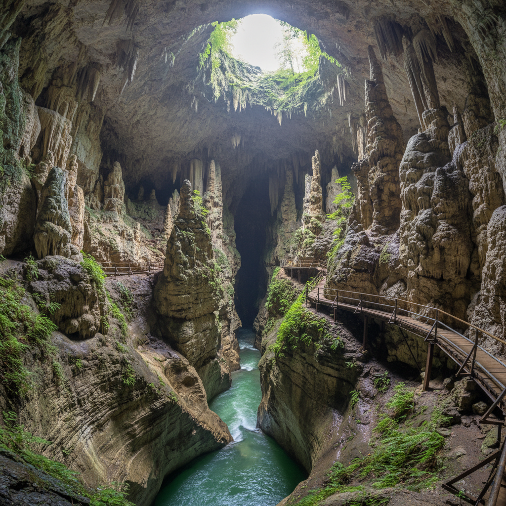The Škocjan Caves in Slovenia represent one of the world's most significant underground river systems and hold UNESCO World Heritage status for their exceptional geological and hydrological importance. This remarkable cave system, carved by the Reka River as it disappears underground for 22 miles before emerging at the Adriatic Sea, offers visitors the opportunity to witness one of nature's most dramatic underground landscapes. The guided tour includes a walk across a 150-foot-high bridge suspended over the underground river canyon, providing breathtaking views of the rushing water far below and the massive chambers that dwarf human visitors. What makes Škocjan Caves extraordinary for novice cavers is the combination of easy accessibility and genuine geological significance—the well-maintained pathways and safety features allow comfortable exploration of cave passages that rival the world's most challenging systems in terms of scale and beauty. The caves maintain a constant temperature of around 54°F year-round, and the infrastructure includes handrails, non-slip surfaces, and strategic lighting that highlights the cave's most impressive features while preserving the natural environment. The tour guides, trained in both geology and cave ecology, provide detailed explanations of the karst processes that created these massive underground chambers, the unique ecosystem that thrives in the cave's various microenvironments, and the ongoing scientific research that continues to reveal new aspects of this complex underground system. The cave's significance extends beyond geology to include archaeological importance, with evidence of human habitation dating back thousands of years, adding cultural depth to the natural wonder. The sound of the underground river provides a constant reminder of the dynamic forces that continue to shape these passages, while the scale of the chambers—some large enough to contain entire buildings—demonstrates the incredible power of water to carve through solid limestone over geological time.